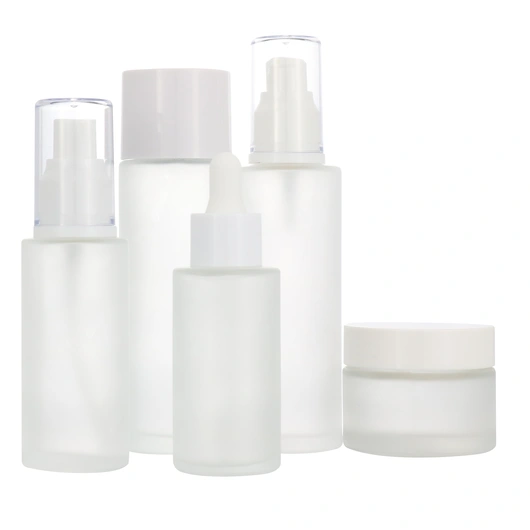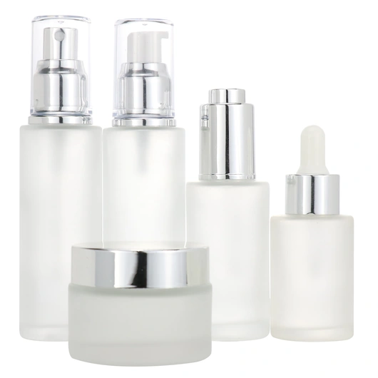 Luxury frosted clear empty glass cosmetic packaging skincare set lotion bottle and cream jar with aluminum cap